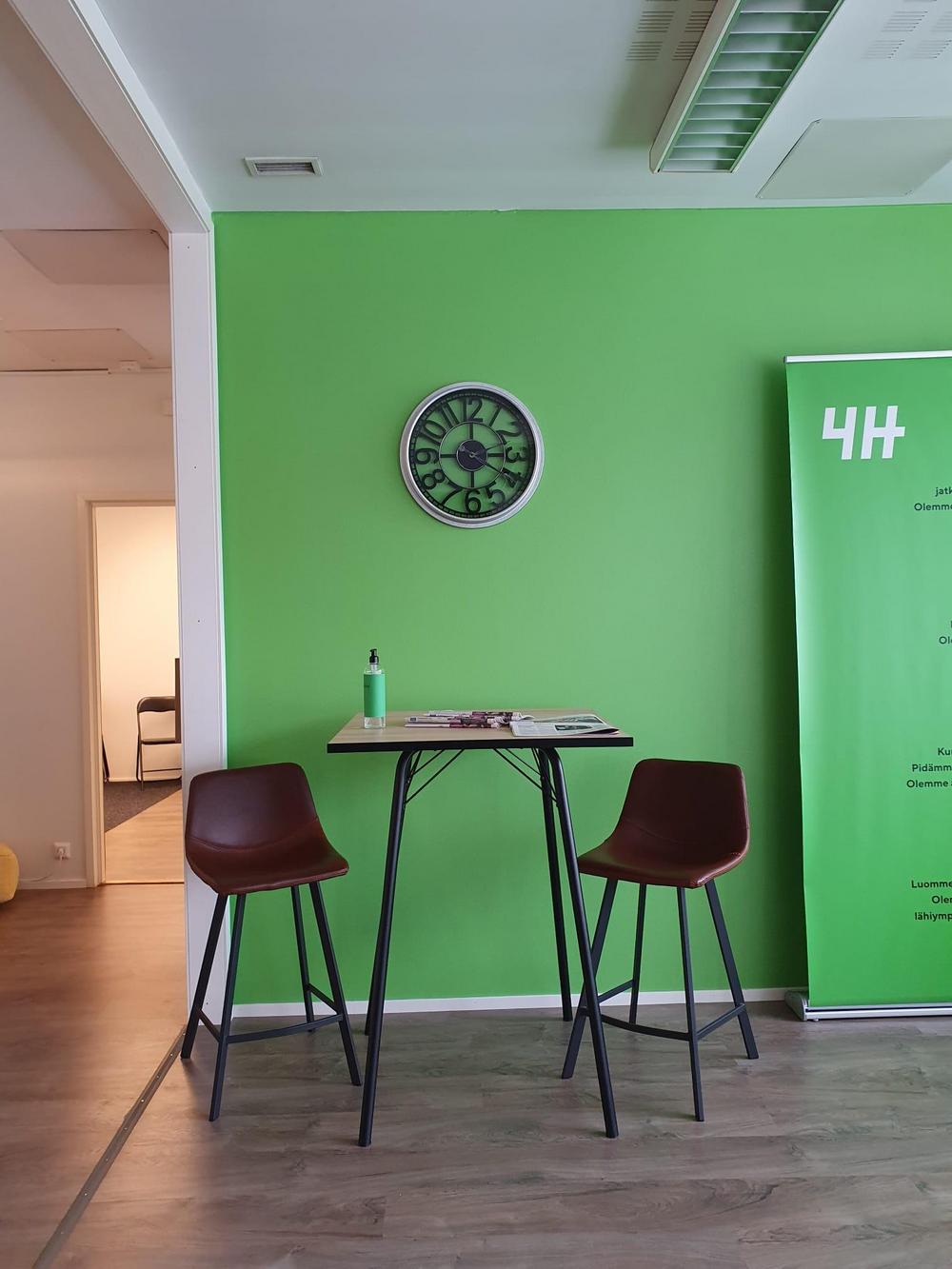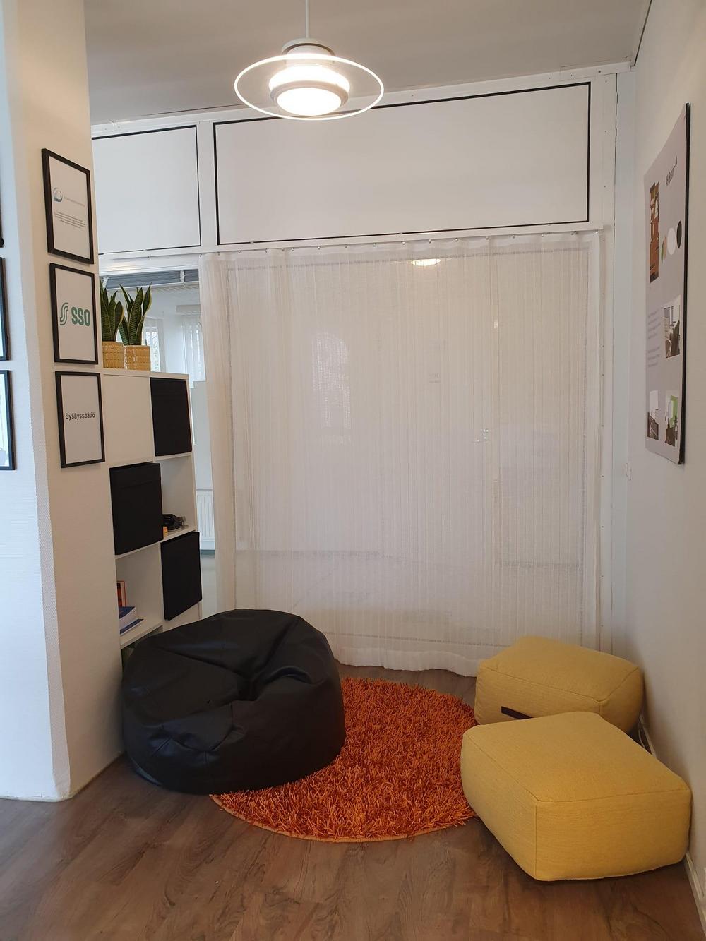 - Sohvanurkkaus: sohva, sohvapöytä ja kaksi nojatuolia rentoon oleiluun, asiakastapaamisiin ja kahvihetkiin. Käytössä myös työskentelytaso, jotta homma hoituu ergonomisesti myös sohvalta käsin.