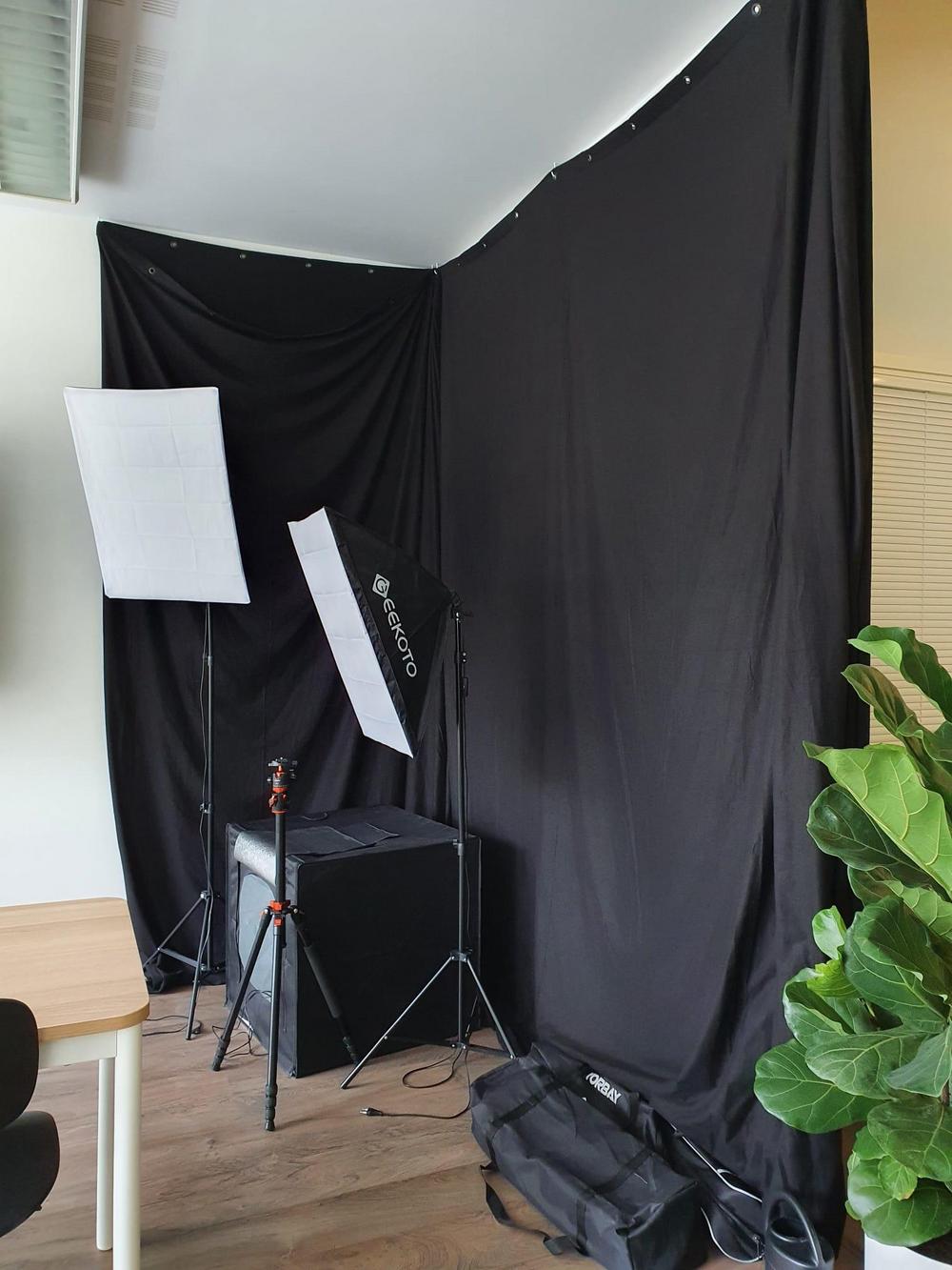 - Pieni valokuvausstudio: kuvausvalot x2 (soft boxeilla), musta taustakangas, laadukas video/valokuvakamera, tuotekuvaukseen soveltuva kuvausboksi