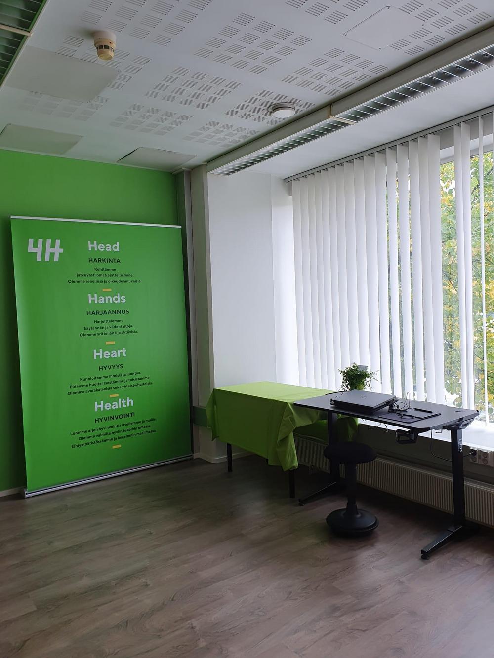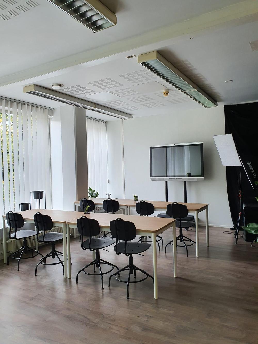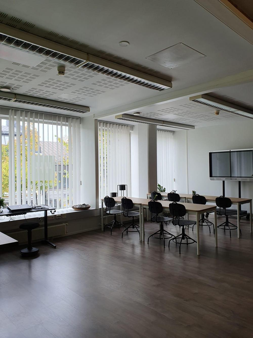 - Kokous/koulutustila: neljästä pöydästä muodostuvan kokouspöydän ympärille mahtuu 12 hlö tai 4hlö/pöytä, lisätuoleja, laadukas esitysnäyttö, jossa sisäänrakennettu tietokone (esimerkiksi netin käyttö tai vaikka Teams-yhteys onnistuu siis kätevästi).