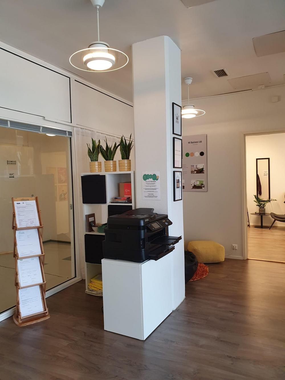 - Sohvanurkkaus: sohva, sohvapöytä ja kaksi nojatuolia rentoon oleiluun, asiakastapaamisiin ja kahvihetkiin. Käytössä myös työskentelytaso, jotta homma hoituu ergonomisesti myös sohvalta käsin.
