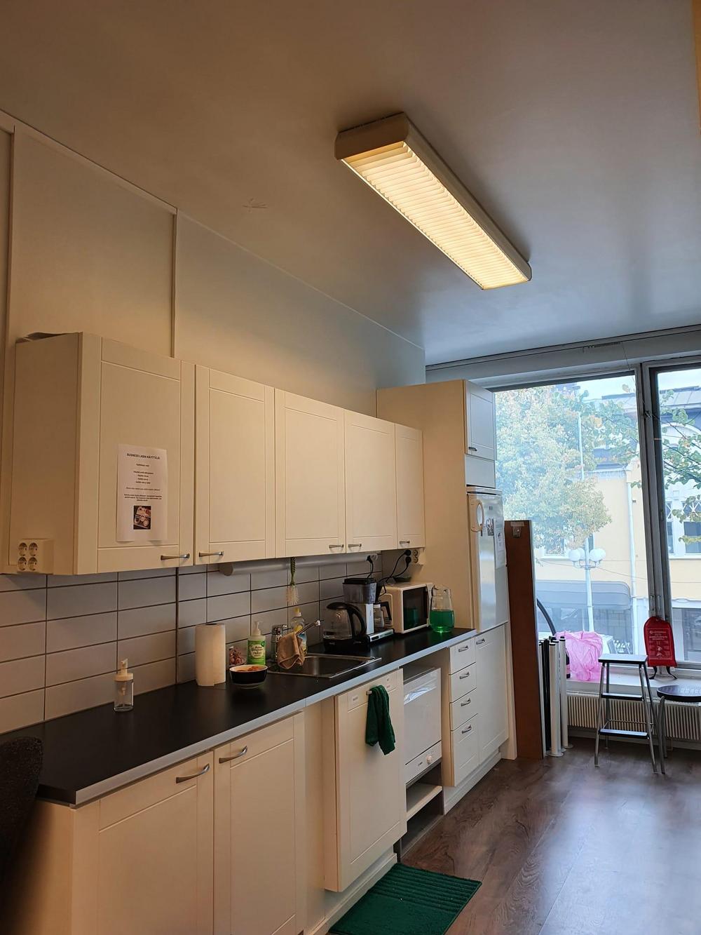- Keittiö: jääkaappi, mikro, kahvin- ja vedenkeitin. Myös kahvia ja teetä löytyy. Tuo kuitenkin oma kahvimaito, jos sellaista käytät!