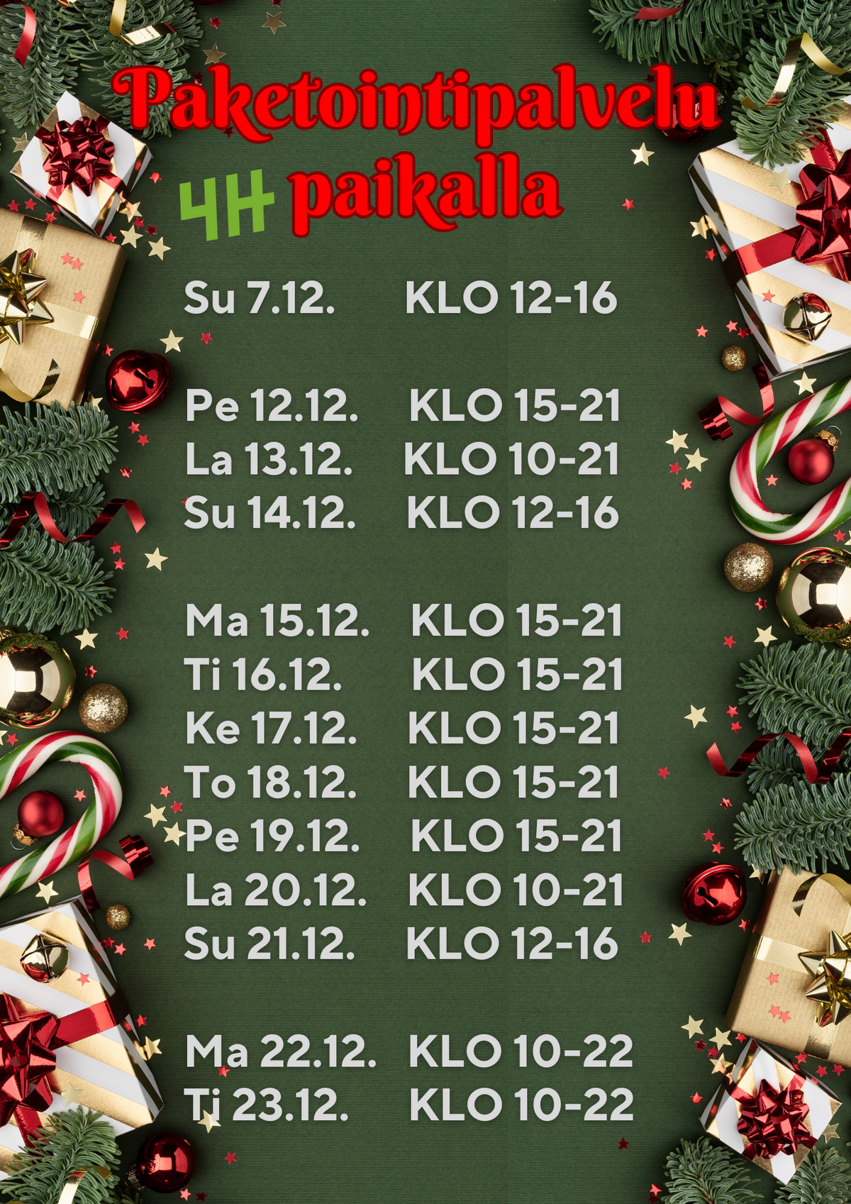 Palkkatyötä tekevät 4H-nuoret ja sunnuntaisin vapaaehtoisina toimivat hallituksen jäsenet tarjoavat paketointipalvelua Halikon Prismalla 7.-23.12. välillä. Tule kääräyttämään lahjaostoksesi kätevästi kauniiksi paketiksi. Palvelu maksaa 2 € per paketti. Vaihtoehtoisesti voit itse päättää suuremman kannatussumman, tukeaksesi 4H:n nuorisotoimintaa vieläkin paremmin. Maksu onnistuu kortilla tai käteisellä. Palvelun käyttäminen on helppo tapa tukea paikallista nuorisotyötä. Kaunis kiitos jo etukäteen!