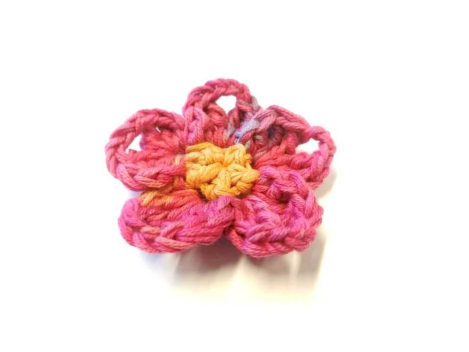 Yhdistä lopuksi piilosilmukalla ensimmäiseen terälehteen. Katkaise lanka ja vedä silmukan läpi, päättele.