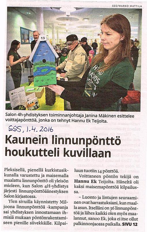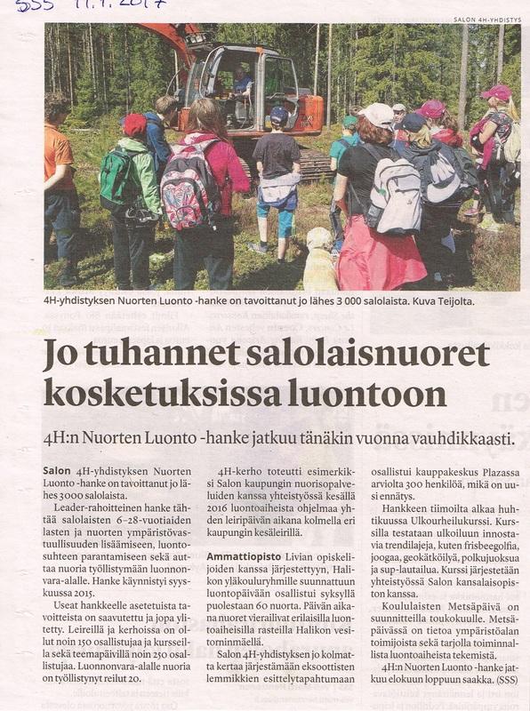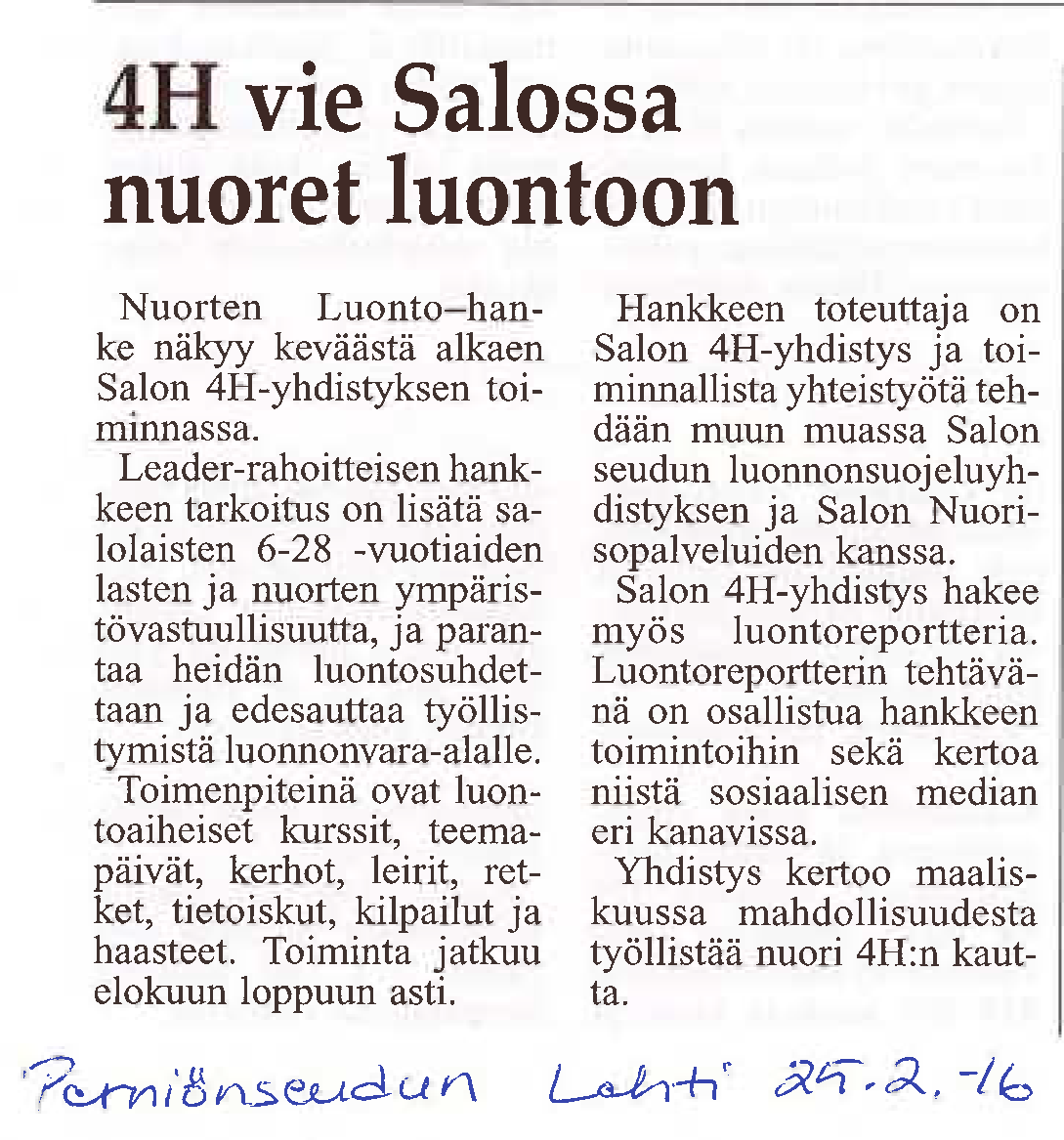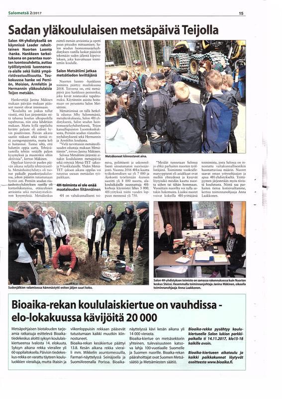Nuorten Luonto -hankkeen lopputapahtuma järjestettiin 1.3.2018 Teijon kansallispuistossa. Salon Seudun Sanomat 2.3.2018.