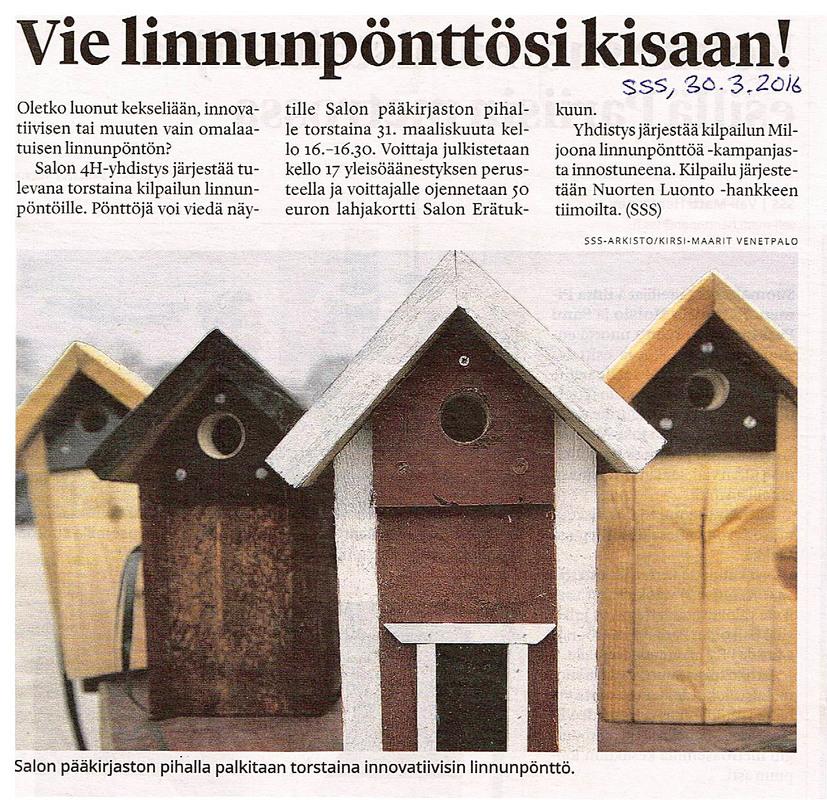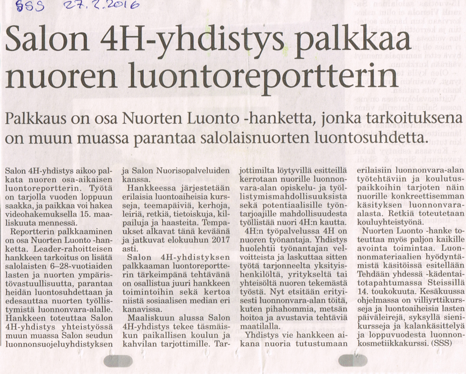 Juttu Nuorten Luonto -hankkeen ohjelmasta Salon messuilla. Salon Seudun Sanomat 21.1.2018.